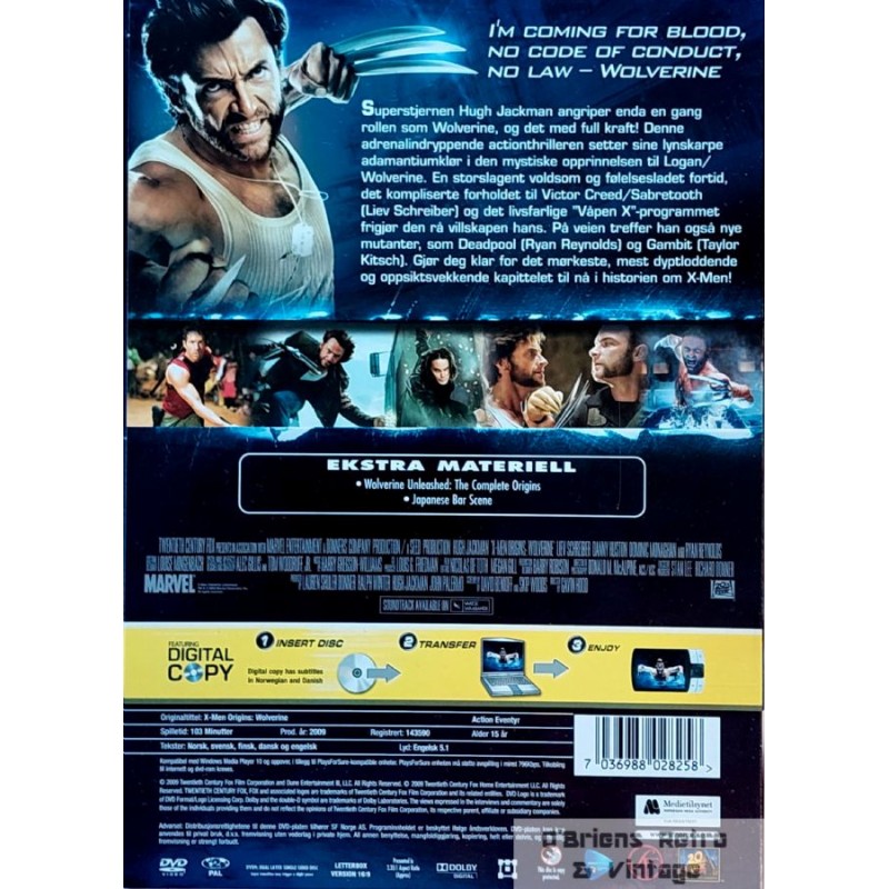 Superheltfilm med Hugh Jackman i rollen som Wolverine. En actionfylt opprinnelseshistorie med karakterer som Deadpool, Gambit og Sabretooth. Spilletid: ca. 107 minutter. Språk: Engelsk, fransk, spansk. Undertekster: Engelsk, fransk, spansk. Region 2. Inneholder bonusmateriale som dokumentar og utvidede scener. DVD-en er i fin stand. Se bilder for mer informasjon om innhold og tilstand.