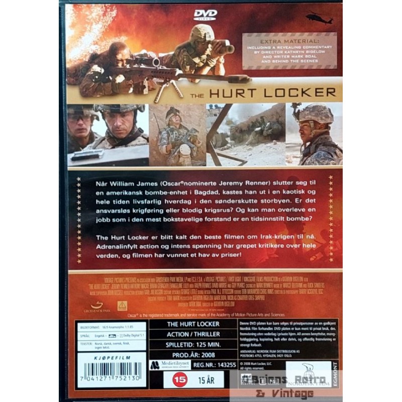 The Hurt Locker. Action-thriller. Spilletid på 125 minutter. Produsert i år 2008. Brukt film på DVD i god stand. Norske undertekster.