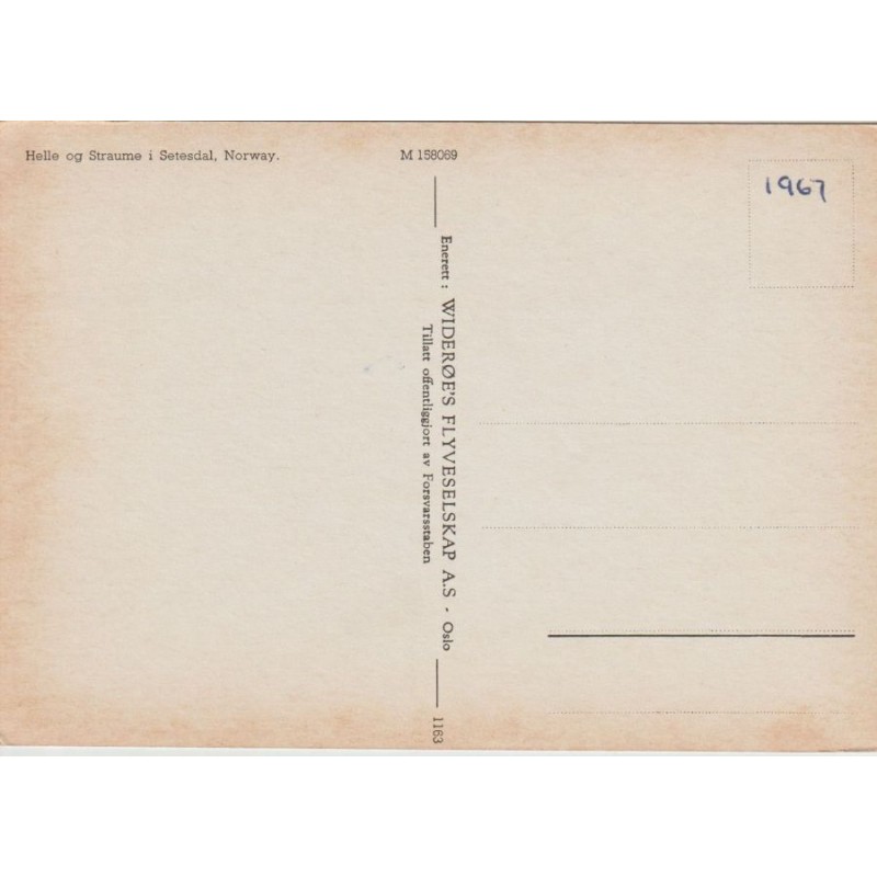 Helle og Straume i Setesdal, Norway. M 158069. Widerøe's Flyveselskap A. S. Ikke postgått, påskrevet med årstall på baksiden, samt litt misfarging på baksiden, i god stand, se scans for kvalitet.