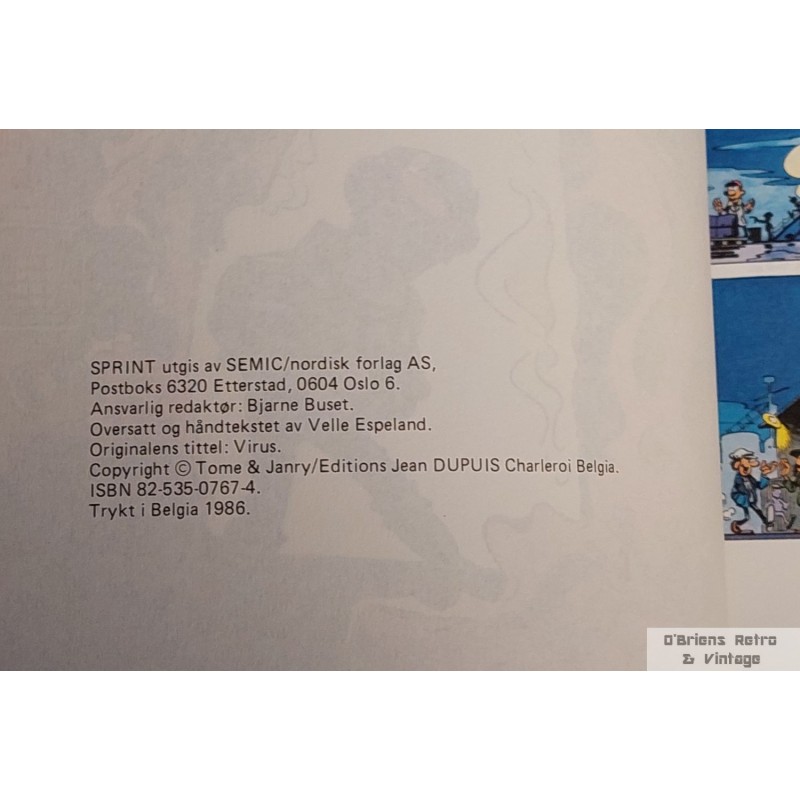 Tegneseriealbum med Sprint fra 1986 i veldig god stand. ISBN 82-535-0767-4. Se bilder for mer informasjon.