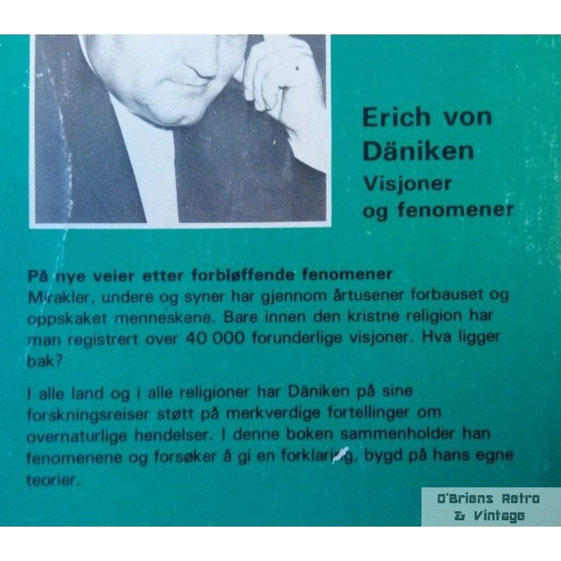 Erich von Däniken: Visjoner og fenomener, Oslo 1980, heftet bok i grei stand, bretter/bruksspor på cover, lest, ingen løse sider, 317 sider.