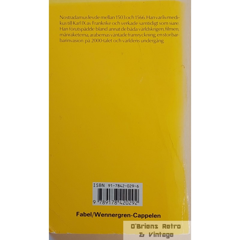 Nostradamus Profetior, Quatrainer i urval om världens öden 1555 - 2797. Etter den tradisjonelle Nostradamusforskningen. Heftet bok i god stand, lest, 241 sider. Svensk. ISBN 91-7842-029-6.