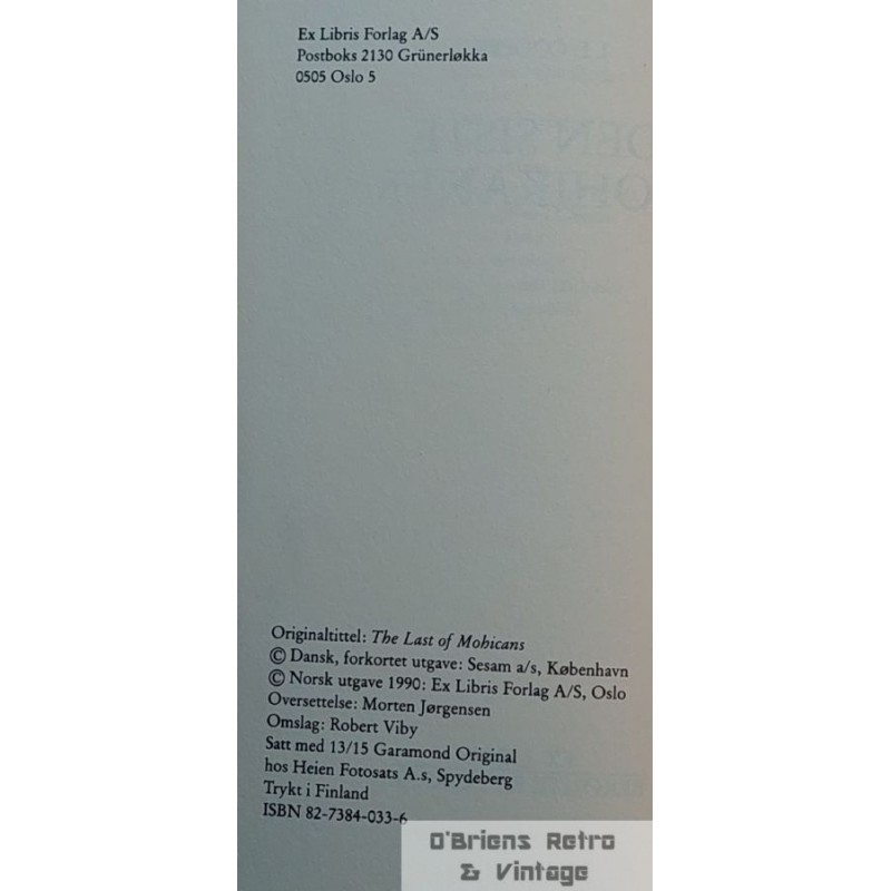 Den siste Mohikaner av J. F. Cooper. Originaltittel: The Last of Mohicans. Hardcover. 1990. ISBN 82-7384-033-6. Veldig god stand. Eiernavn. Se bilder for mer informasjon om boken.