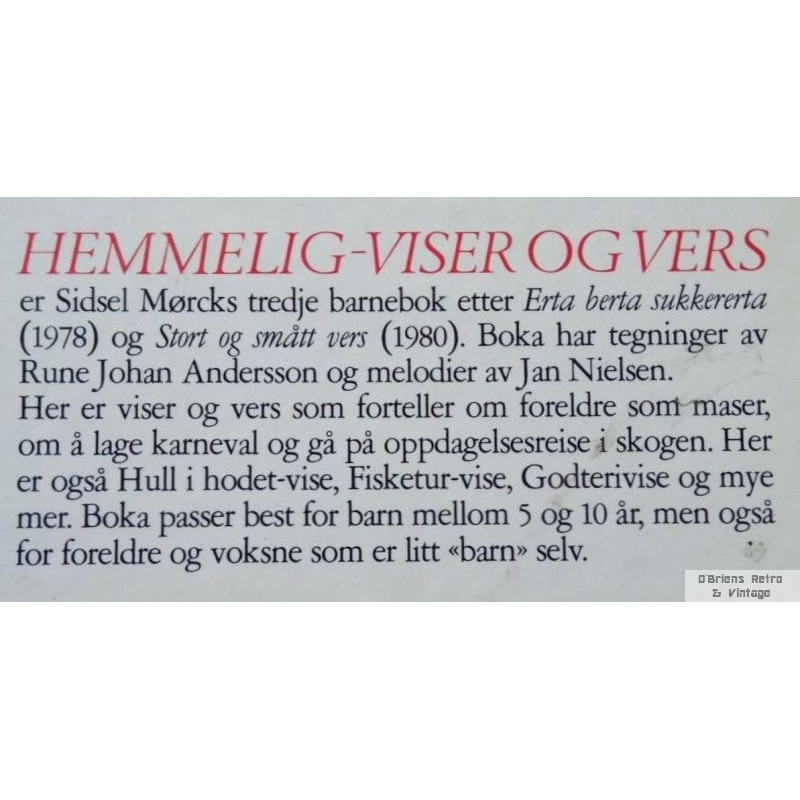 Sidsel Mørck: Hemmelig viser og vers, Oslo 1985, innbundet bok i pen stand, navnet, illustrert, 53 sider. Se bilder for mer informasjon om boken.