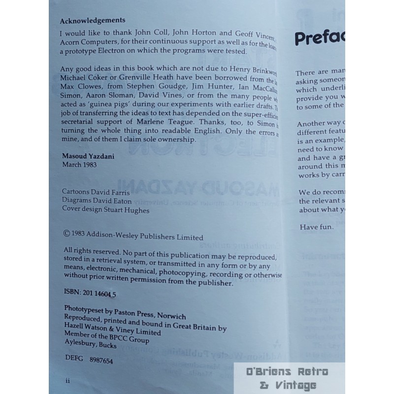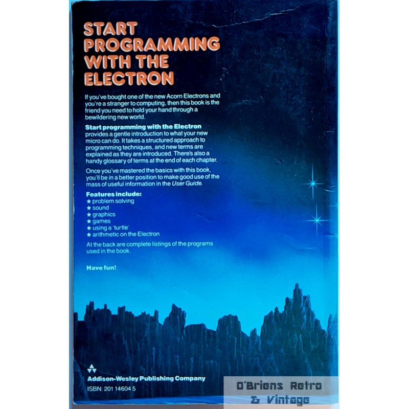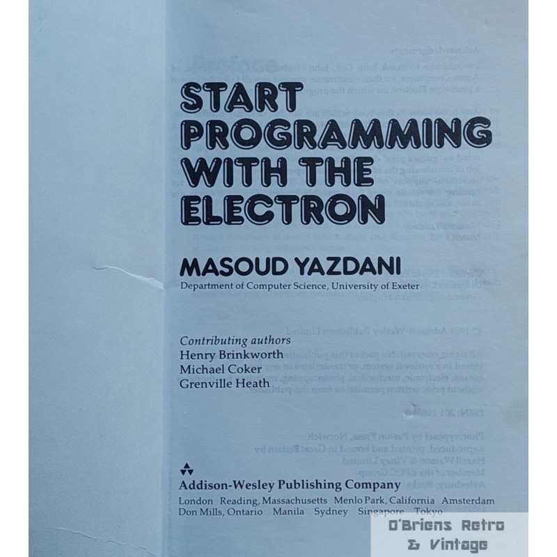 Acorn Electron: Masoud Yazdani: Start Programming with the Electron, London 1983, heftet bok i god stand (godt lest, bruksslitasje, brett på perm), illustrert, 140 sider.