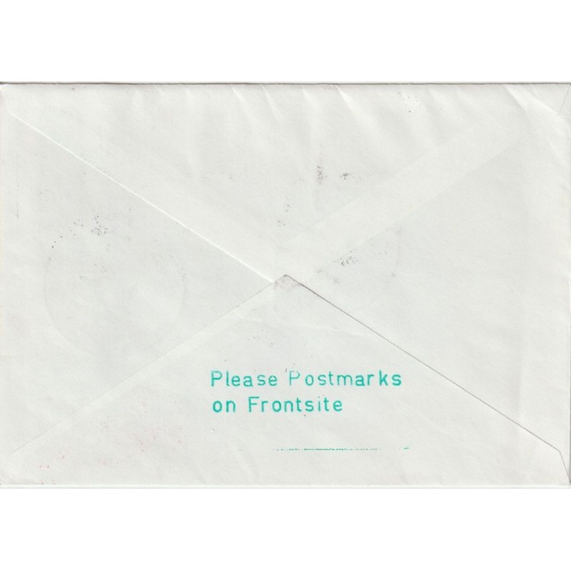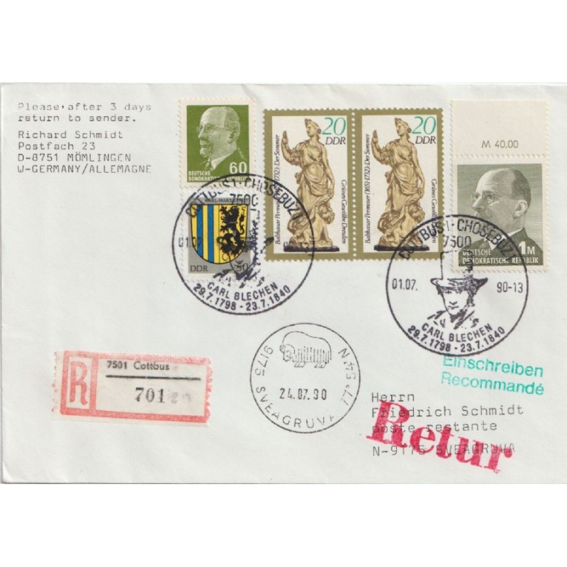 Rekommandert brev sendt fra Mömlingen i Vest-Tyskland til Sveagruva på Svalbard, Norge, i juli 1990. DDR-frimerker, internasjonal ruting og særegne postmarkeringer.