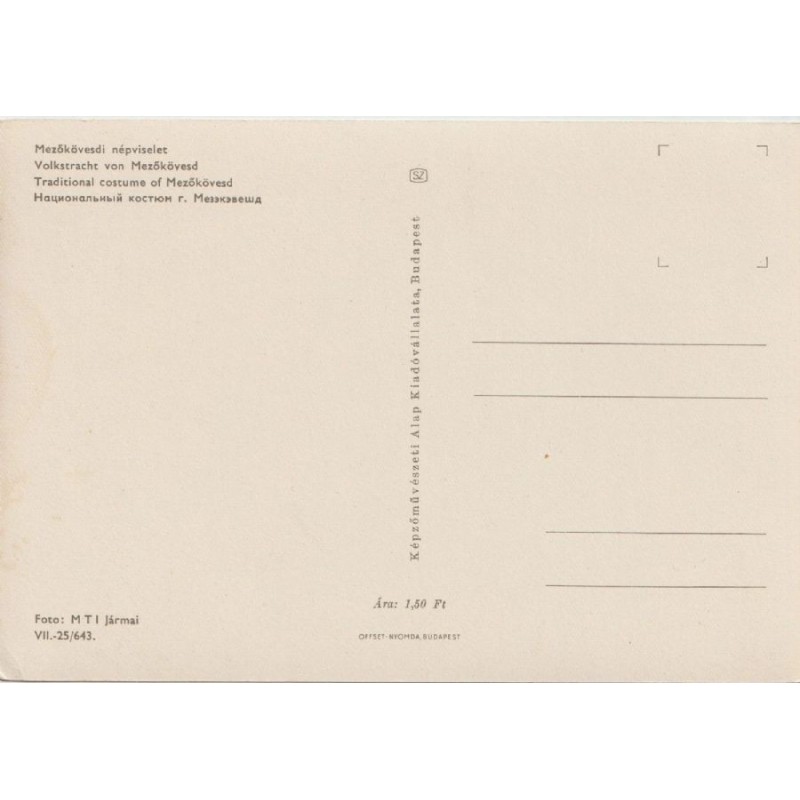 Kepzomuveszeti Alap Kiadovallalata. Foto M T I Jarmai. VII.-25/643. Tre personer i tradisjonelle Matyó-drakter foran folkekunstsenteret “Matyóház”. Detaljert broderi, blomsterhodeplagg og en dukke i matchende antrekk. Ikke postlagt, god stand. Se bilder for kvalitet.
