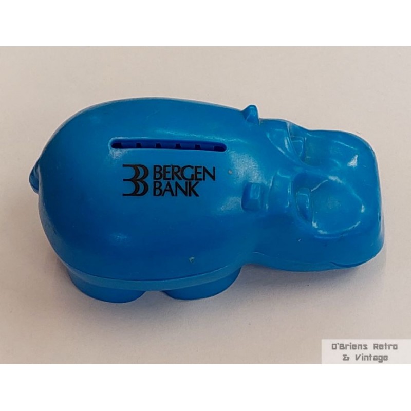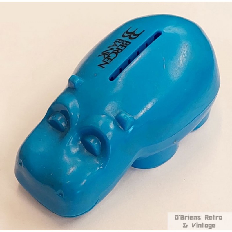 Pen liten sparebøsse i plast. Flodhest fra Bergen Bank. I bra stand, kun med et par små merker i plasten. Uten nøkkel. Laget av Tresmer Oy, Finland. L=10,5 cm.