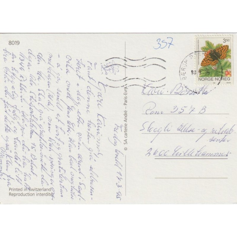 Vakkert postkortmotiv med hest som beiter fredelig i et blomstrende landskap av lilla lyng. Printed in Switzerland. Postgått, fin stand, se scans for kvalitet.