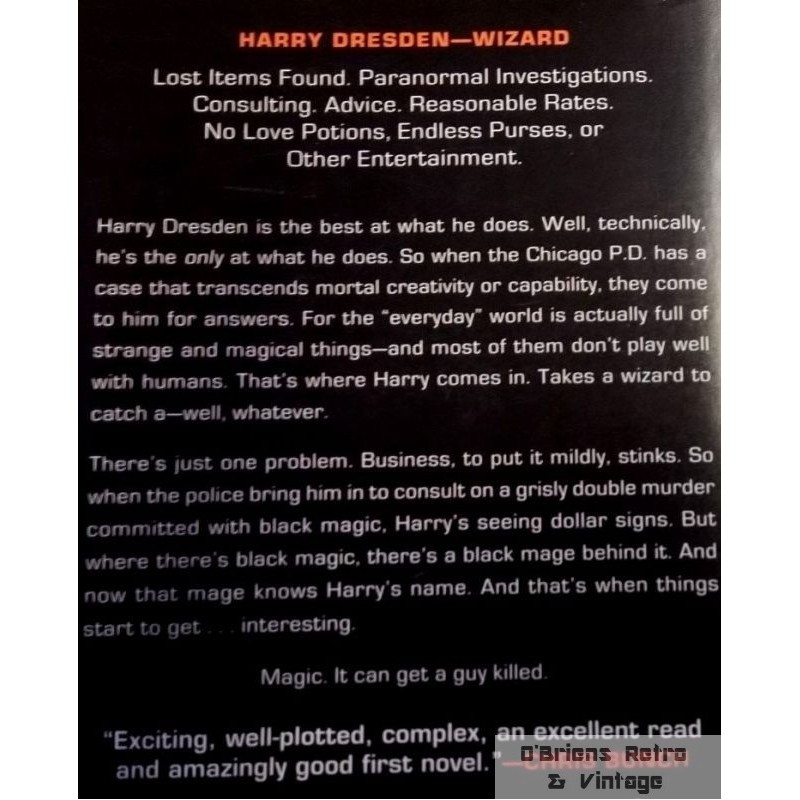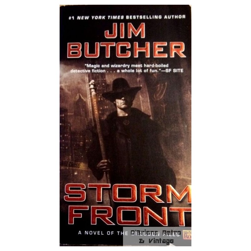Jim Butcher: Stormfront - A Novel of the Dresden Files, pocketbok i fin stand, lest, engelsk språk, 372 sider. Se bilder for mer informasjon om boken. ISBN 978-0-451-45781-3.