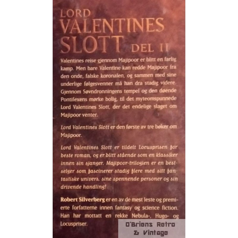 Robert Silverberg: Lord Valentines Slott - Del II - Første bok om Majipoor, Bergen 1999, innbundet bok i veldig god stand, 303 sider. ISBN 82-514-0568-8.