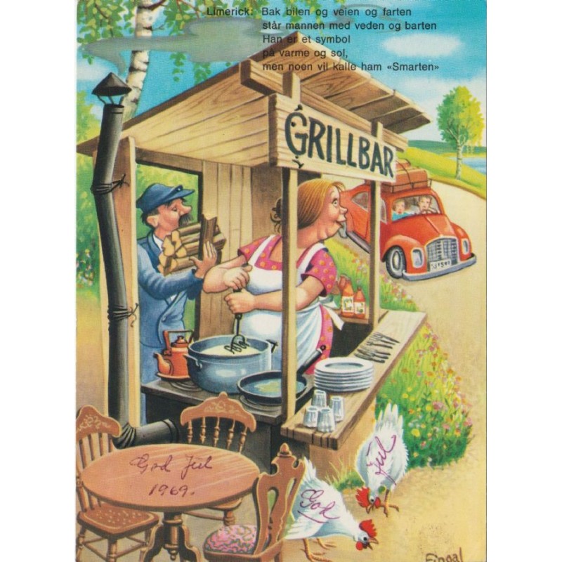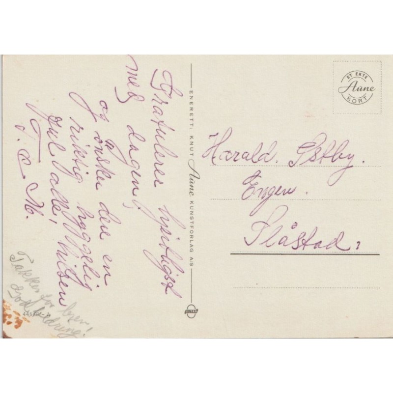 Med artig limerick! Knut Aune Kunstforlag A/S. 446/8-A. Ikke postgått, men påskrevet, flekk på baksiden, se scans for kvalitet.