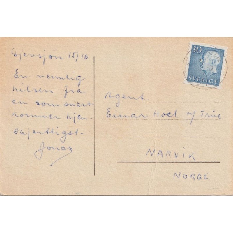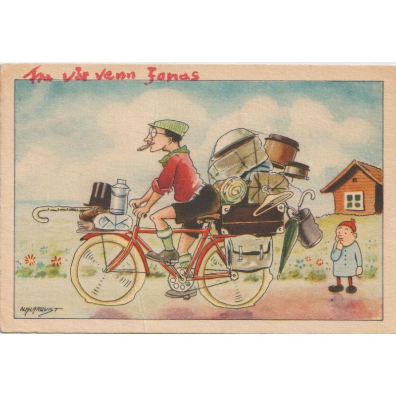 Postkort med tegning av N. Klarqvist. Morsomt motiv av mann på sykkel. Postgått, god stand, brett, se scans for kvalitet.