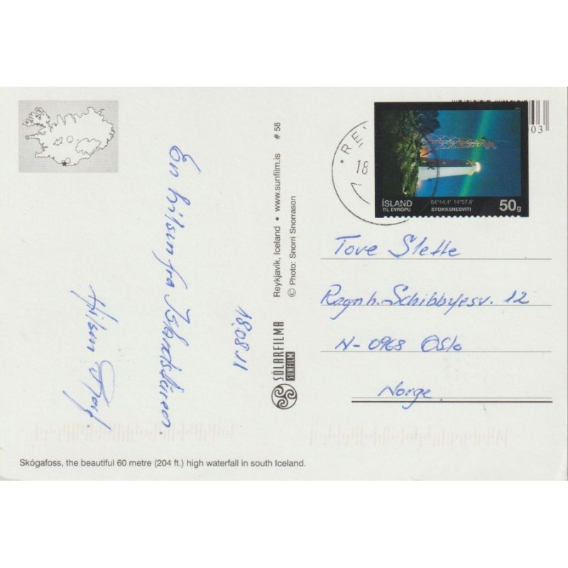 Skogafoss, the beautiful 60 metre high waterfall in south Iceland. Solarfilma. Photo: Snorri Snorrason. Postgått, god stand, se scans for kvalitet.