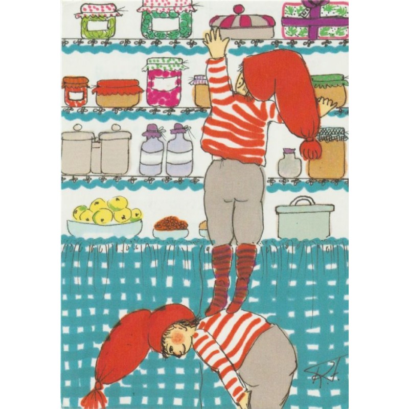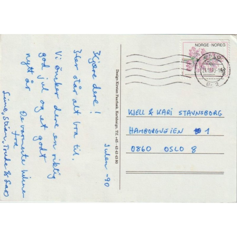 Hyggelig kort med to nisser. Design Kirsten Faarbæk. Kortdesign. Postgått, god stand. Se scans.