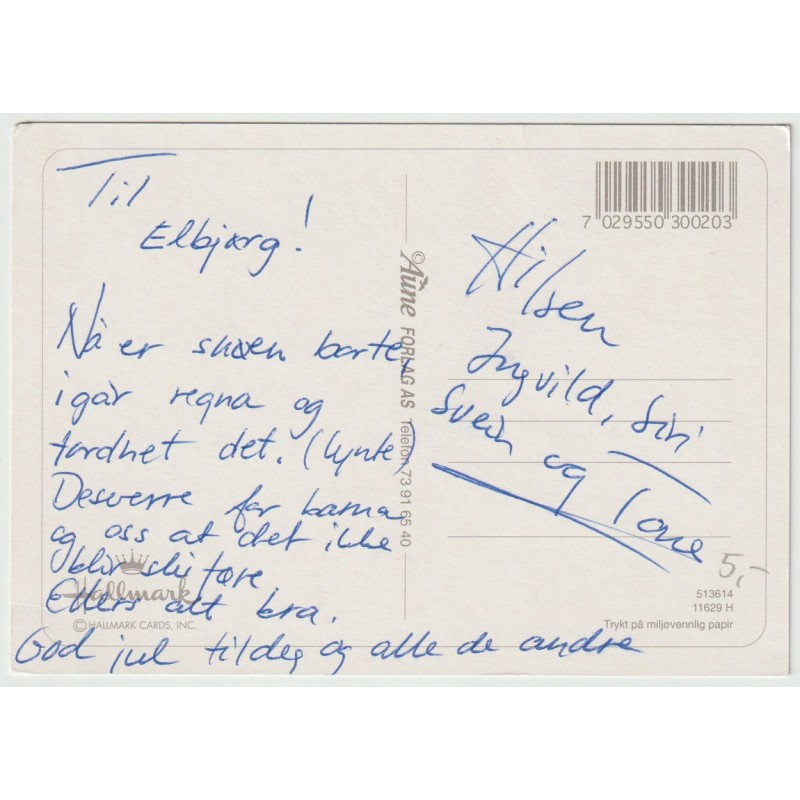 Koselig julekort med tre syngende mus. Hallmark Cards Inc. Aune Forlag AS. 7029550300203. Ikke postgått, men påskrevet. Pen stand, se scans for kvalitet.