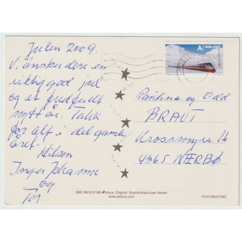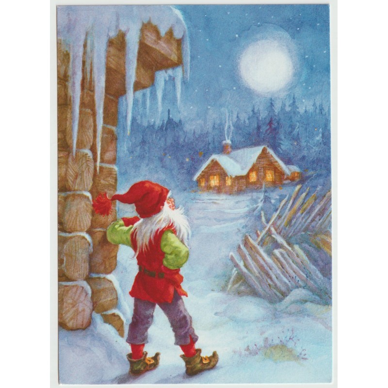 Julekort med en nisse som står og kikker på et hus på avstand. AB Pictura. Original: Gracia Arias/Juan Vernet. 7316198037463. Postgått, veldig god stand, se scans for kvalitet.