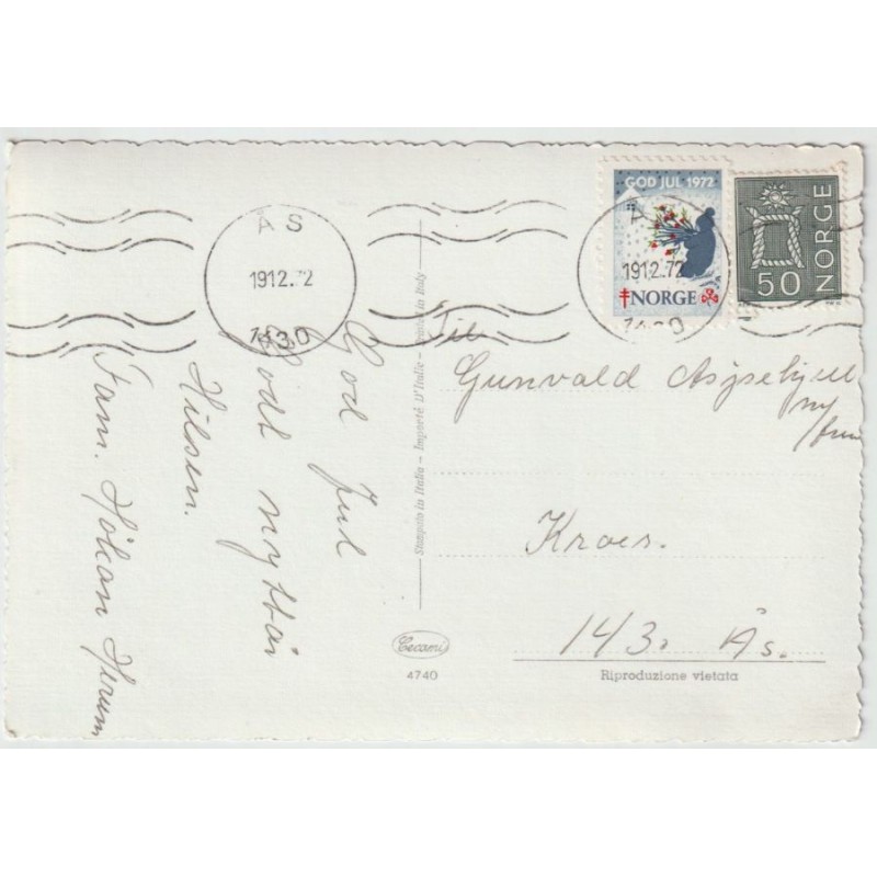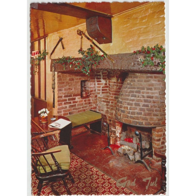 Stemningsfullt julekort med motiv av peis, juledekorasjoner og koselig interiør. Postgått, stemplet Ås. Kortet er i fin stand. Se scans for kvalitet.