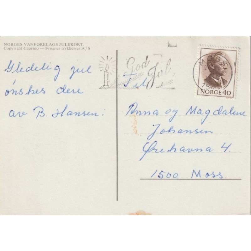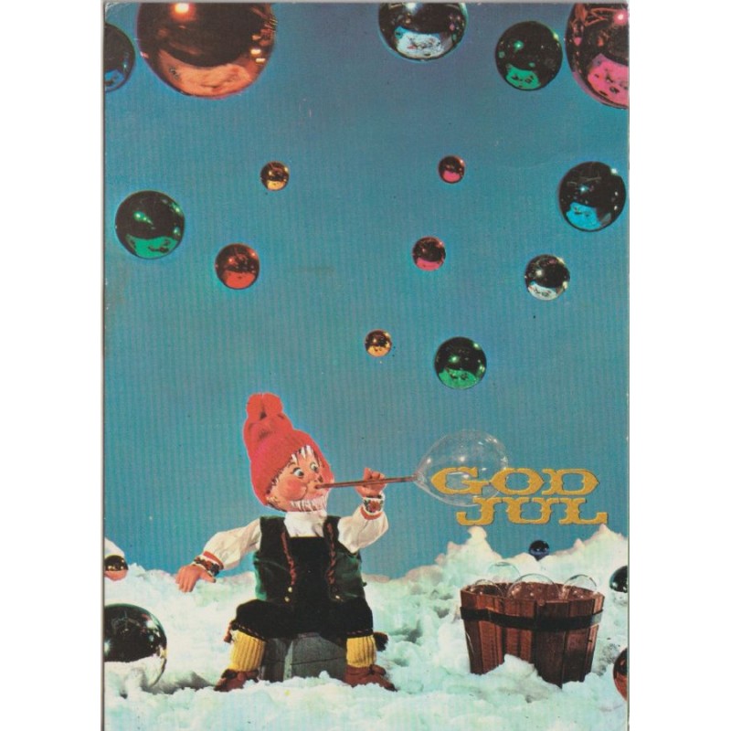 Hyggelig julekort med nisse som blåser bobler. Postgått, god stand, litt flekker på baksiden, se scans for kvalitet.