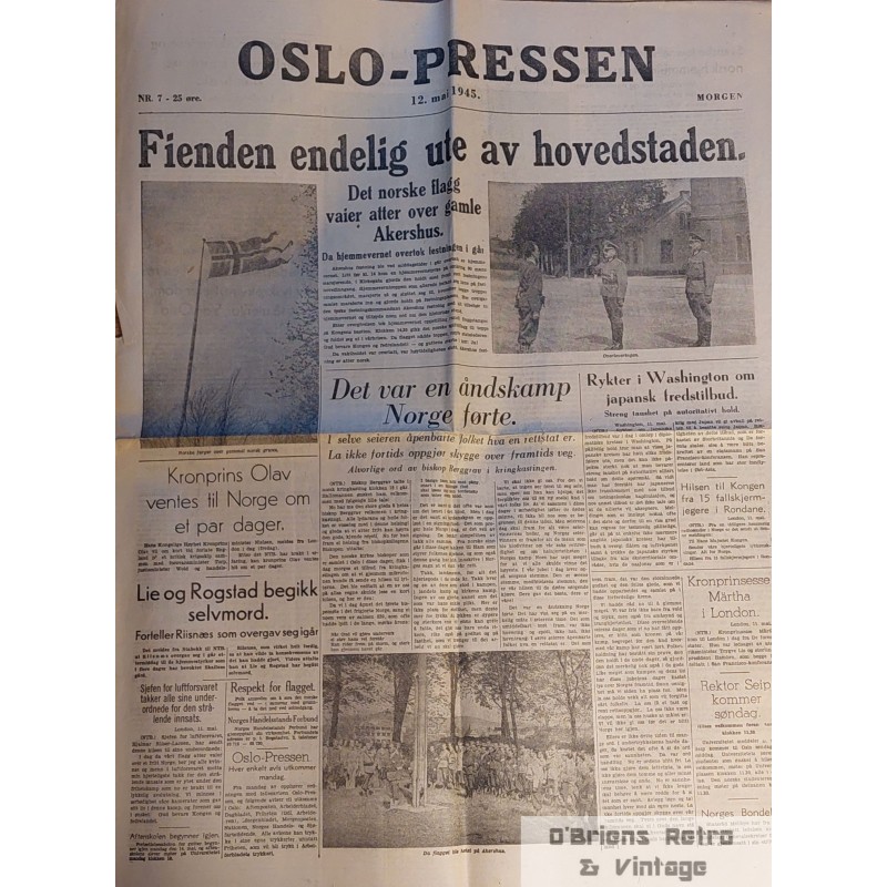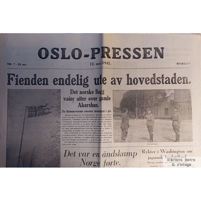 Brukt og lest avis fra 2. verdenskrig i fin stand. Fienden endelig ute av hovedstaden. Det norske flagg vaier atter over gamle Akershus. Se bilder for mer informasjon om avisen.