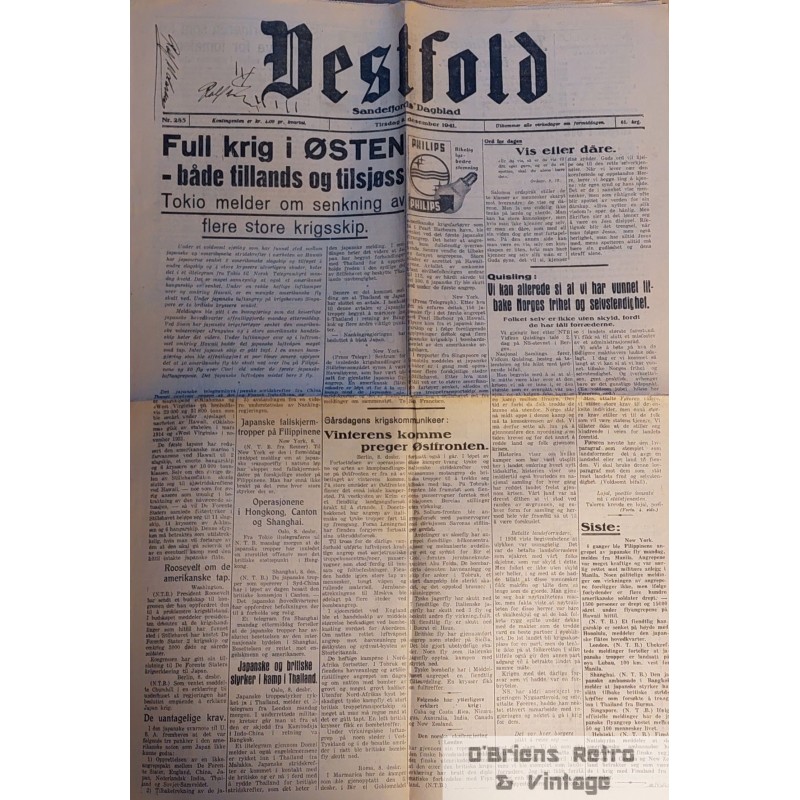 Brukt og lest avis fra 2. verdenskrig i fin stand. "Full krig i ØSTEN - både tillands og tilsjøss." Se bilder for mer informasjon om avisen.