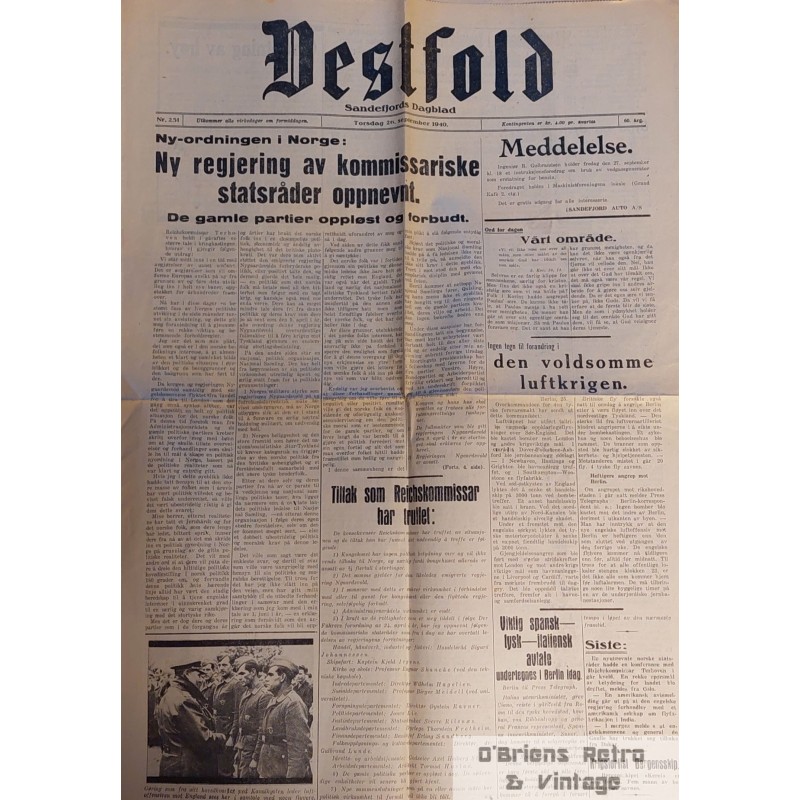 Brukt og lest avis fra 2. verdenskrig i god stand, men med rifter og utklipp, ellers grei. Ny-ordningen i Norge. De gamle partier oppløst og forbudt. Se bilder for mer informasjon om avisen.