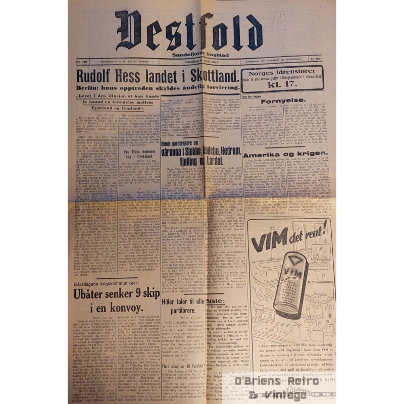 Brukt og lest avis fra 2. verdenskrig i god stand, men har en stor rift på baksiden, ellers grei. Rudolf Hess landet i Skottland. Amerika og krigen. Se bilder for mer informasjon om avisen.