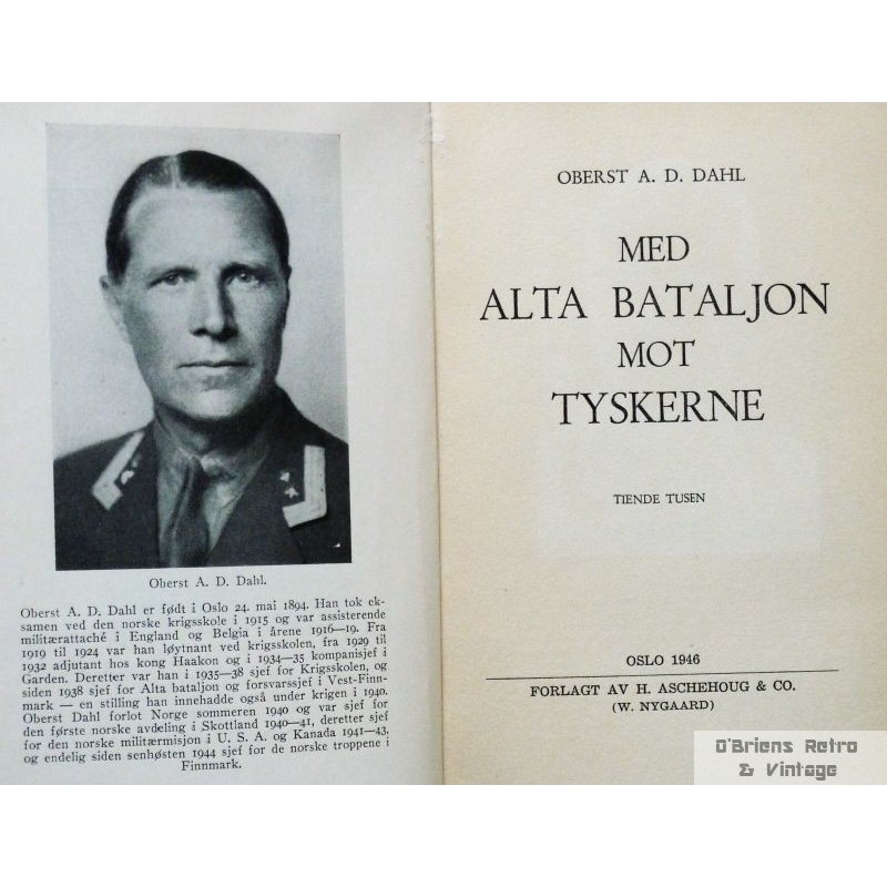 General A.D. Dahl - Med Alta bataljonen mot tyskerne, Oslo 1946, 10. tusen. Heftet bok med gulnet rygg og omslag, illustrert, 154 sider. Se bilder for mer informasjon om boken.