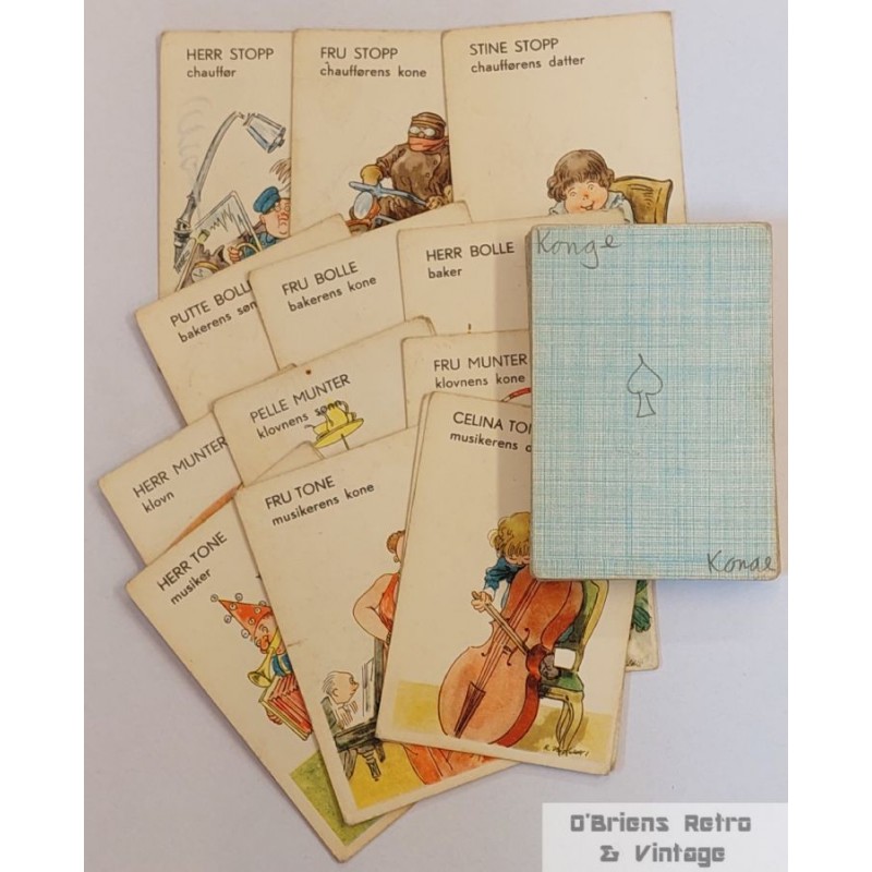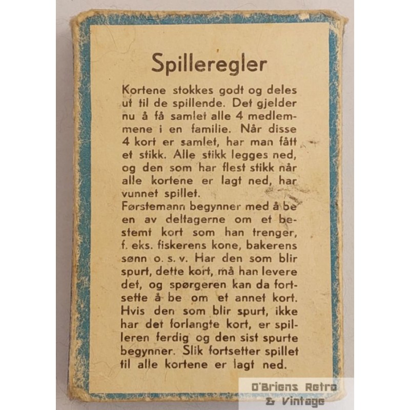 Eldre kortspill. Instruksjoner på baksiden av esken. Noen har konvertert kortene (de har ført opp vanlige kort på baksiden), ellers i grei stand. Her mangler det kort, men ser noenlunde komplett ut. Selges som vist.