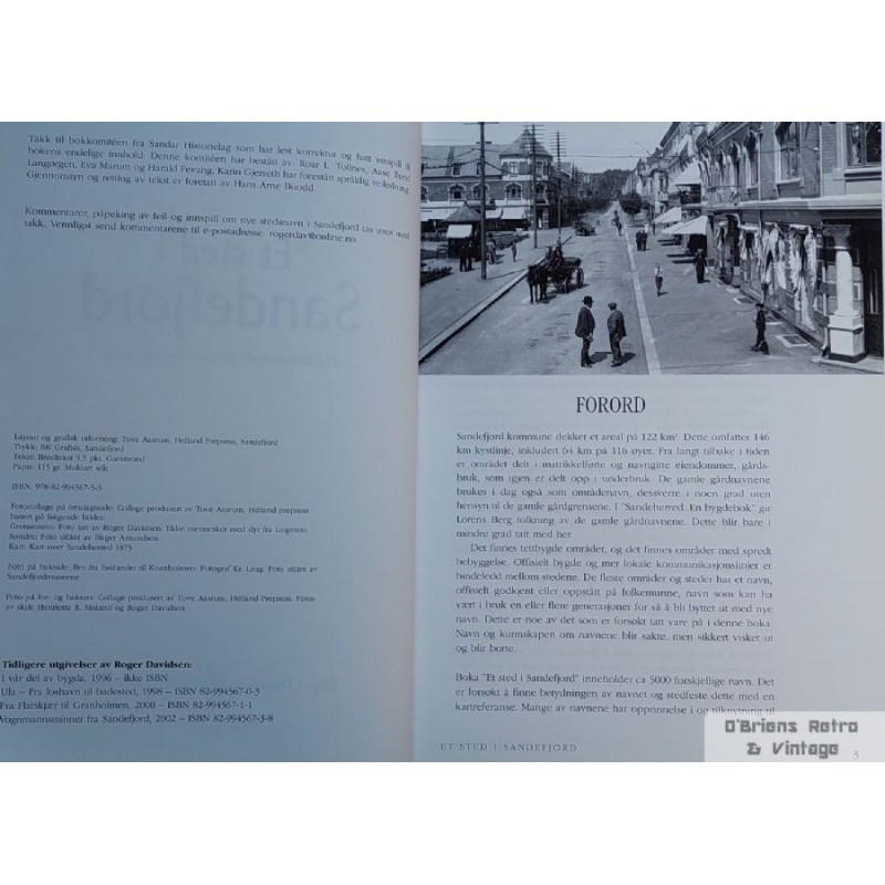Roger Davidsen: Et sted i Sandefjord. Lokalhistorisk stedsnavnsleksikon. Sandar Historielag 2008. Innbundet bok i meget bra stand, fint illustrert, 462 sider. Se bilder for mer informasjon om boken.