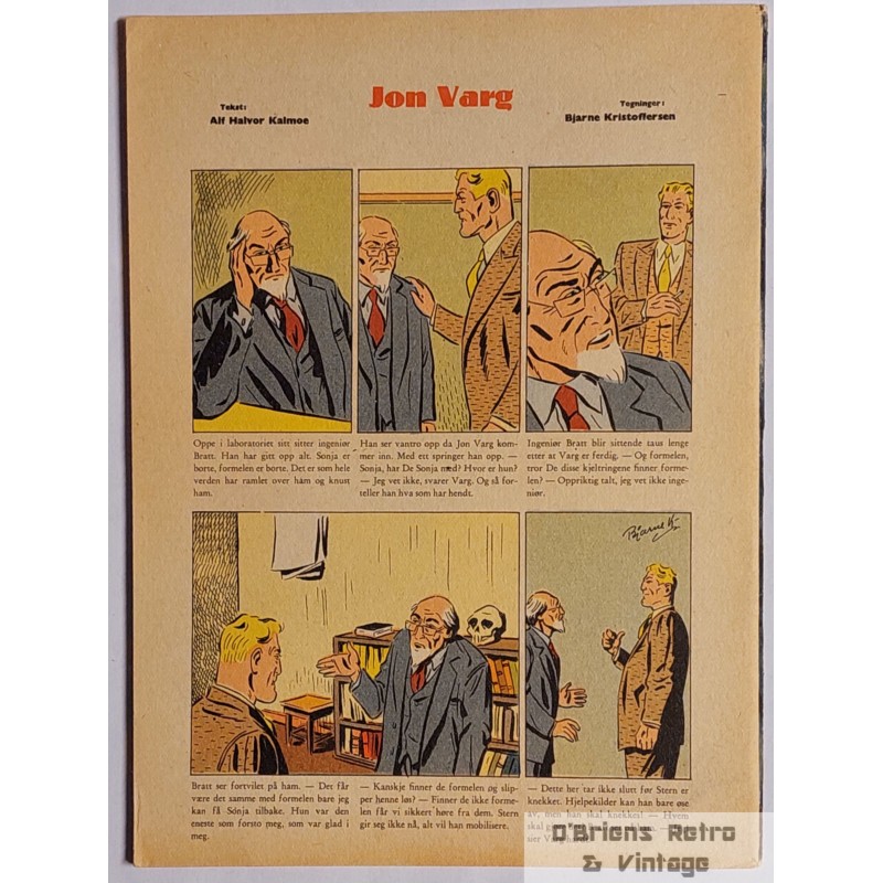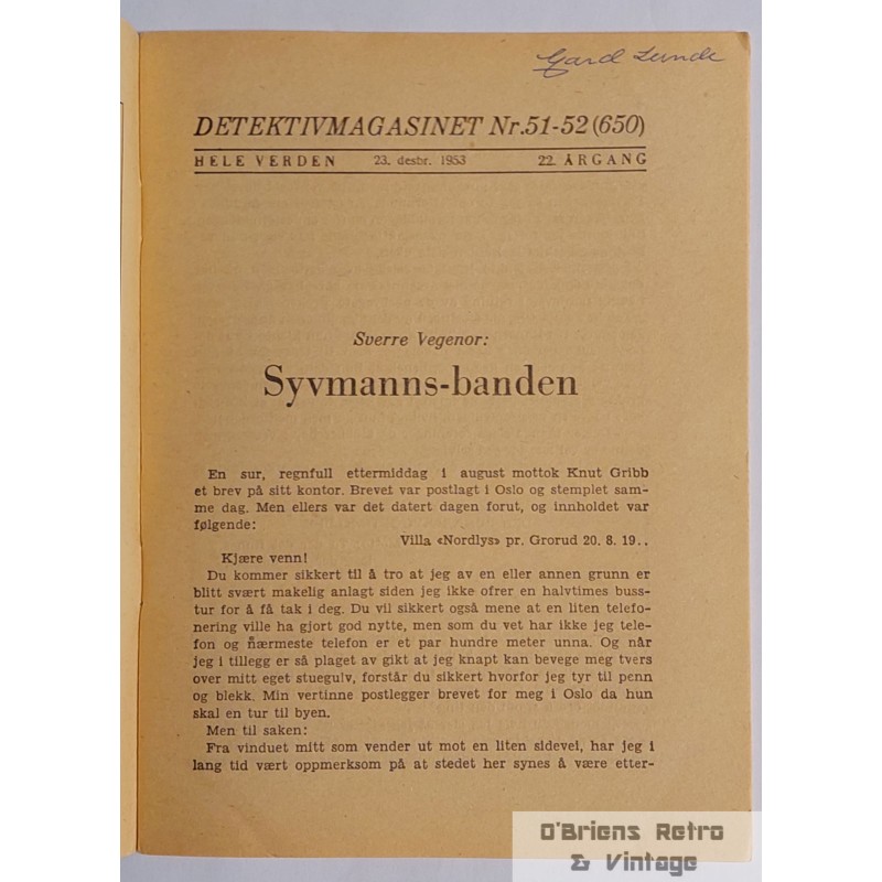 Detektiv-Magasinet fra 1953 i veldig god stand, men har eiernavn. Med historien Syvmanns-banden av Sverre Vegenor. Se bilder for mer informasjon om heftet.