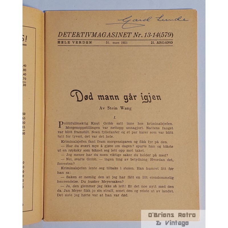 Detektiv-Magasinet fra 1951 i pen stand, men har eiernavn. Med historien Død mann går igjen av Stein Wang. Se bilder for mer informasjon om heftet.