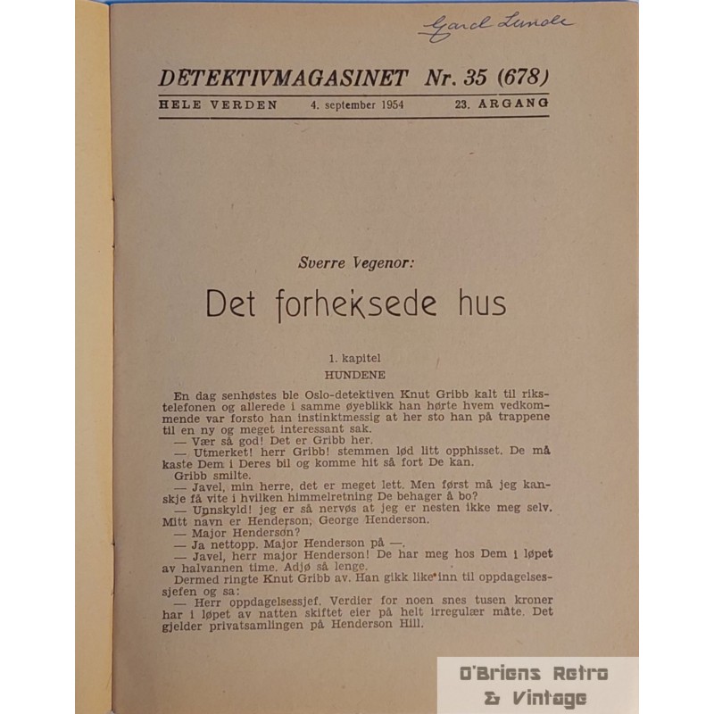 Detektiv-Magasinet fra 1954 i veldig god stand, men har eiernavn. Med historien Det forheksede hus av Sverre Vegenor. Se bilder for mer informasjon om heftet.