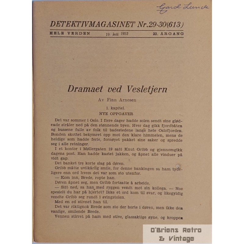 Detektiv-Magasinet fra 1952 i pen stand, men har eiernavn. Med historien Dramaet ved Vesletjern av Finn Arnesen. Se bilder for mer informasjon om heftet.