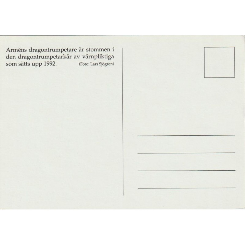 Armens dragontrumpetare är stommen i den dragontrumpetarkår av värnpliktiga som sätts upp 1992. Foto: Lars Sjögren. Ikke postgått, pen stand, se scans for kvalitet.