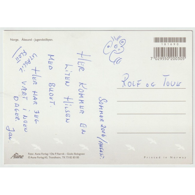 Norge. Ålesund. Jungendstilbyen. Aune Forlag. Printed in Norway. 7029550200305. Ikke postgått, men påskrevet, pen stand, se scans for kvalitet.