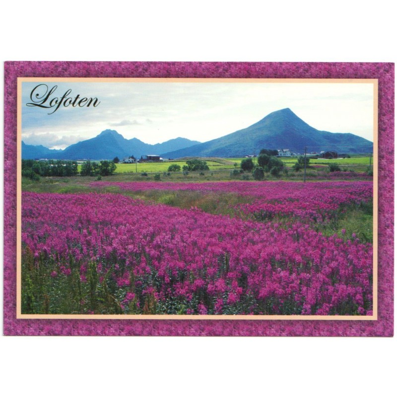 Lofoten, Norway. 2664. TO-FOTO AS. Foto: Tommy Simonsen. Nydelig motiv med en stor eng med blomstrende geitrams. Flotte farger! Ikke postgått, veldig god stand, se scans for kvalitet.