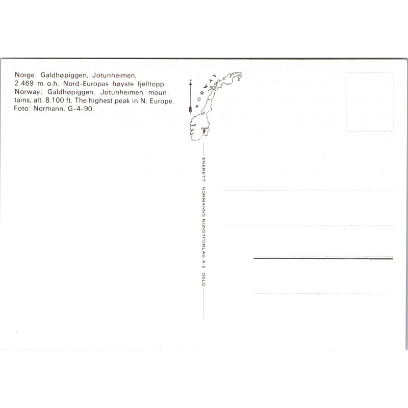 Norge: Galdhøpiggen. Jotunheimen. 2.469 m.o.h. Nord-Europas høyeste fjelltopp. Normanns Kunstforlag A.S. Ikke postgått, veldig god stand, se scans for kvalitet.