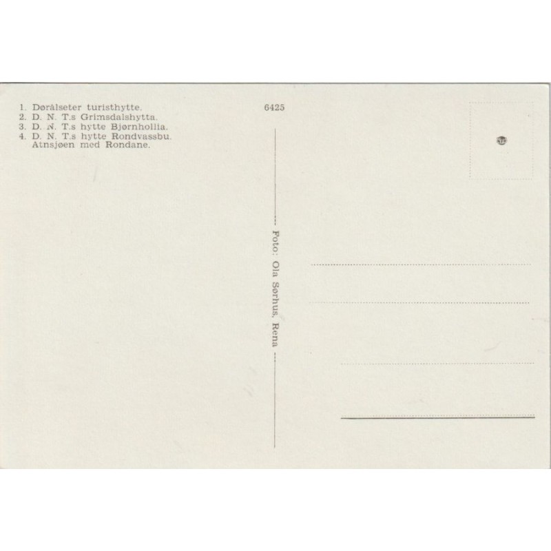 Dørålseter turisthytte, Grimsdalshytta, Bjørnhollia, Rondvassbu, Atnsjøen med Rondane. Foto: Ola Sørhus, Rena. 6425. Ikke postgått, fin stand, se scans for kvalitet.