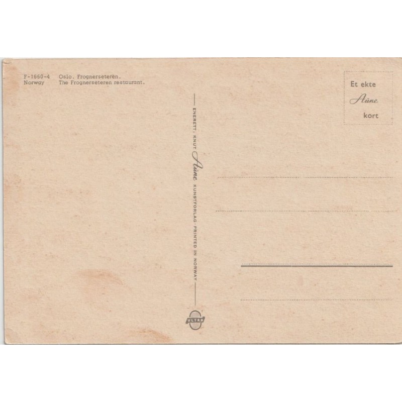 F-1660-4. Oslo. Frognerseteren. Knut Aune Kunstforlag. Ikke postgått, men bruksspor, noe flekker på baksiden, hjørnebrett. Se scans for kvalitet.