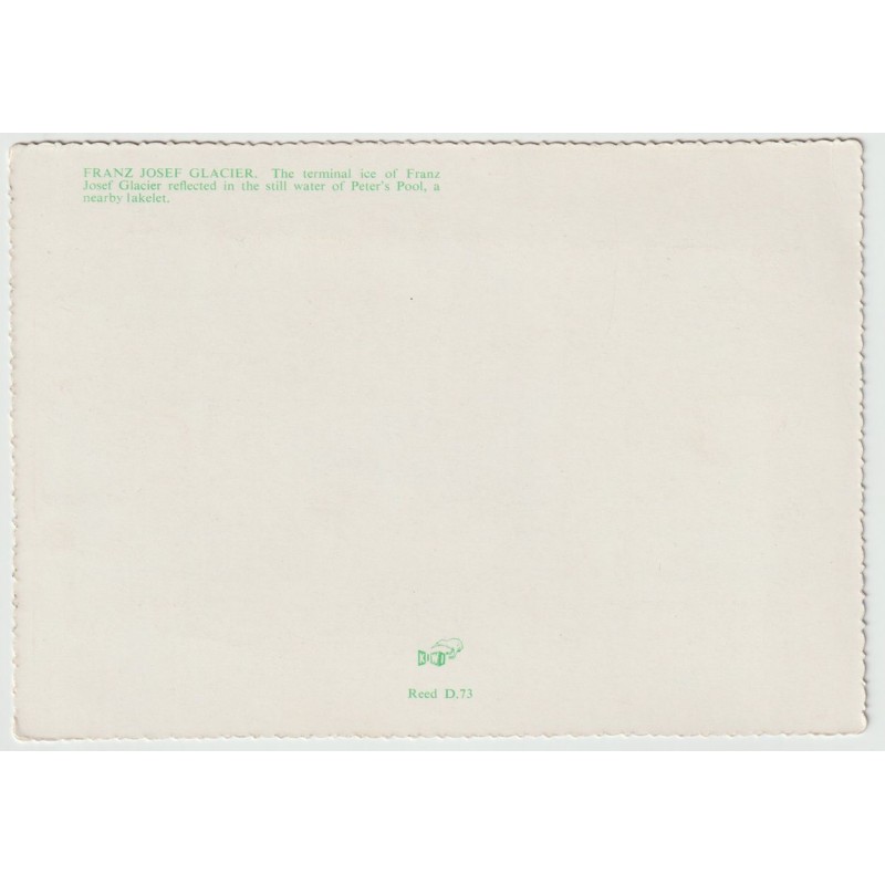 Franz Josef Glacier. The terminal ice of Franz josef Glacier reflected in the still water of Peter's Pool, a nearby lakelet. Reed D.73. Ikke postgått, veldig god stand, se scans for kvalitet.