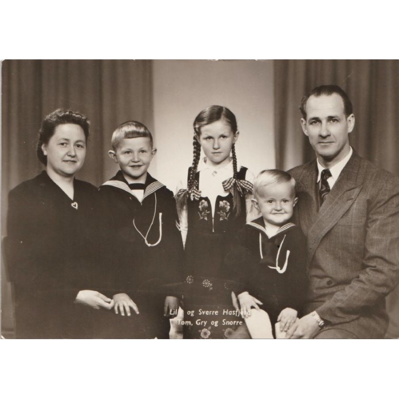 Lily og Sverre Hasfjord. Tom, Gry og Snorre. Ikke postgått, påskrevet, pen stand, se scans for kvalitet.