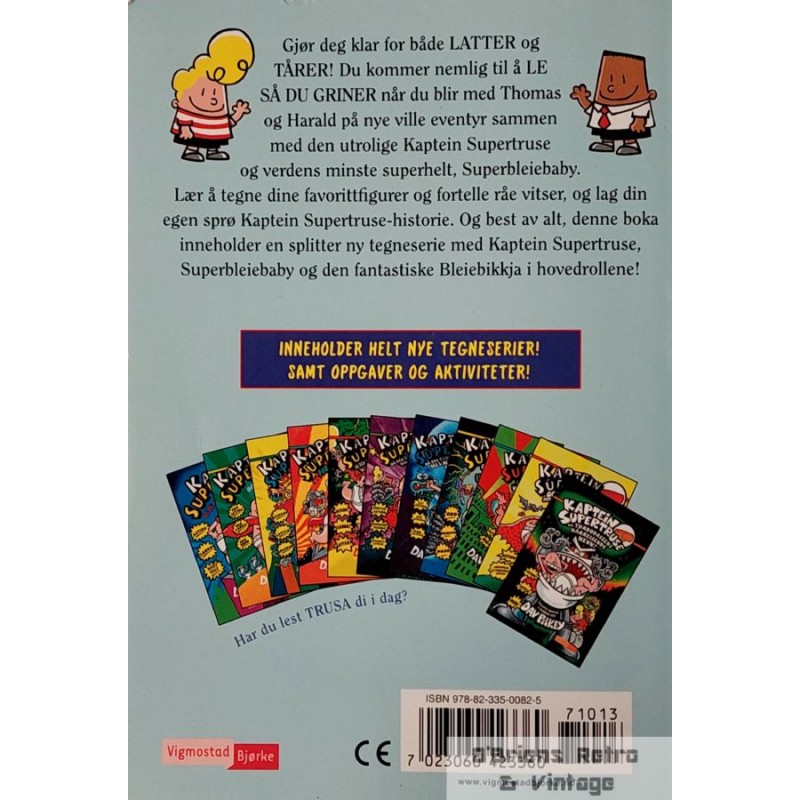 Dav Pilkey: Kaptein Supertruses Megasprø Morobok 2, Oslo 2017, 1. opplag, pocketbok i pen stand, tegneserier og diverse andre morosaker, 96 sider. ISBN 978-82-335-0082-5. Se bilder for mer informasjon om boken.