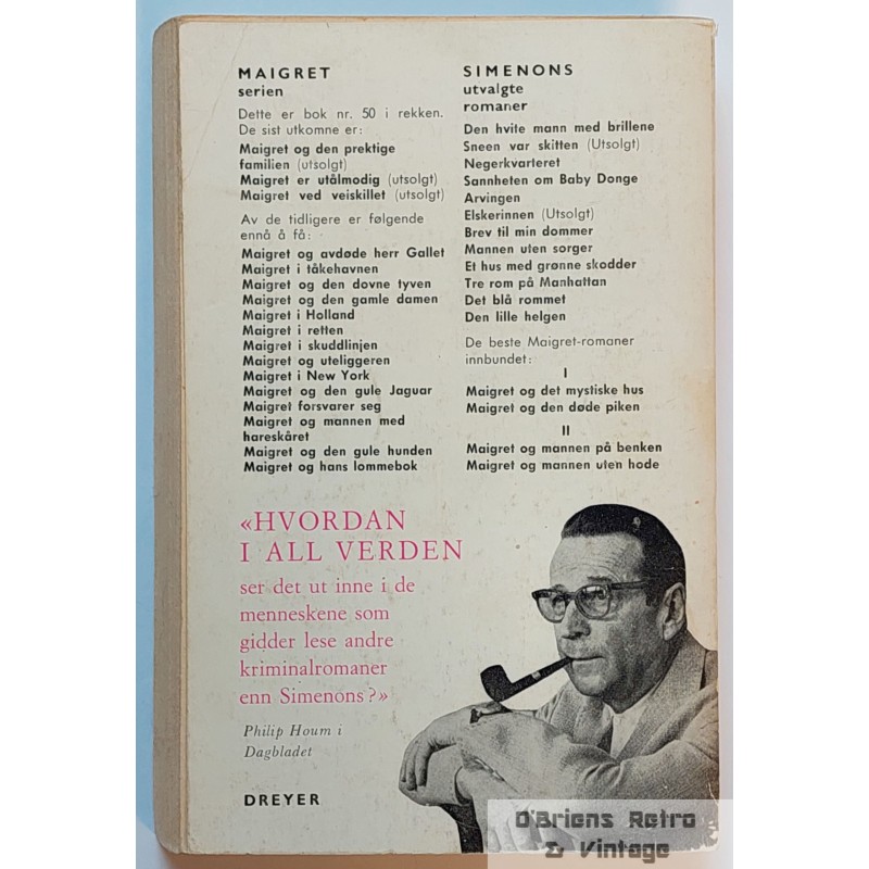 Simenon: Maigret og den synske damen. Oslo 1969. Krimbok i god stand. Lest, hjørnebrett bakre perm, ellers bra. 190 sider.