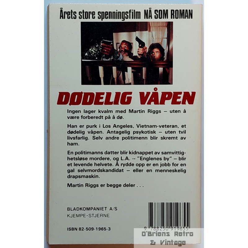 Joel Horst: Dødelig våpen, Oslo 1987, pocketbok i pen stand, 253 sider. Roman av Joel Norst. Basert på et filmmanus av Shane Black. 9788250919655. Bladkompaniet.