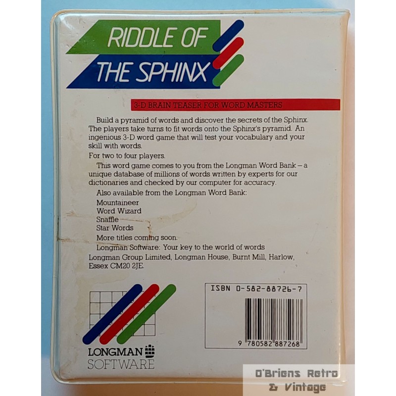 "Build a pyramid of words and disocver the secrets of the Sphinx. The players take turns to fit words onto the Sphinx's pyramid. An ingenious 3-D word game that will test your vocabulary and your skill with words."