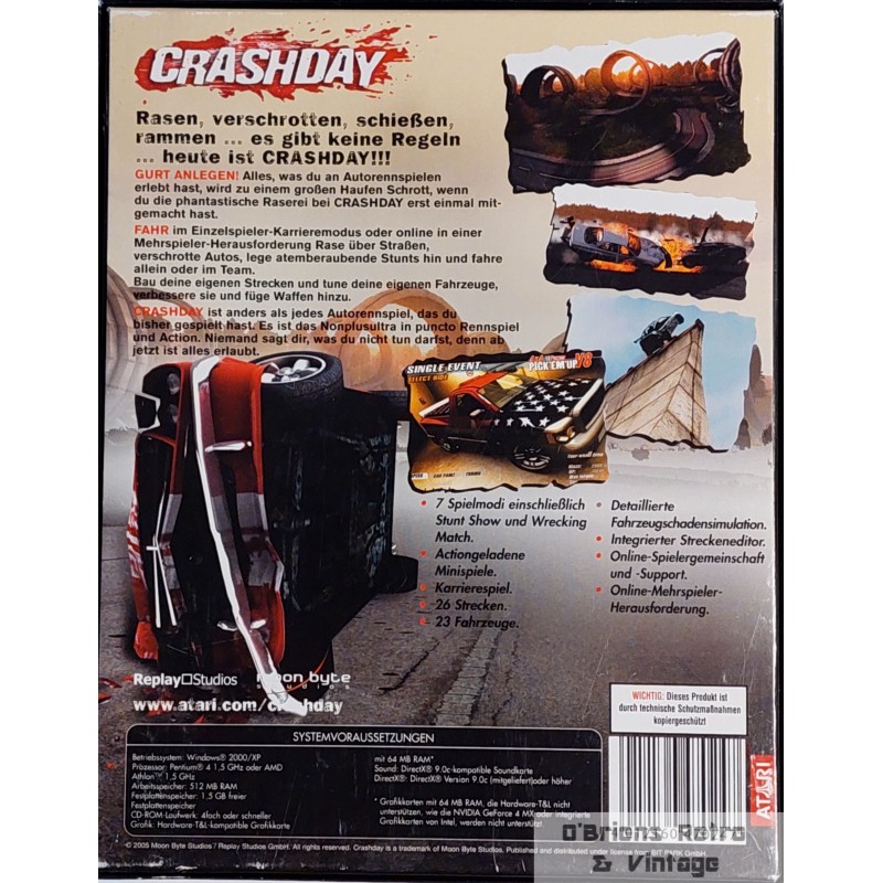 Crashday fra Moon Byte Studios og Atari til PC på CD-ROM. Kommer i eske. Alt i pen stand, men manual følger ikke med. 4012160470247. Tysk utgivelse, se bilder for mer informasjon om spillet.