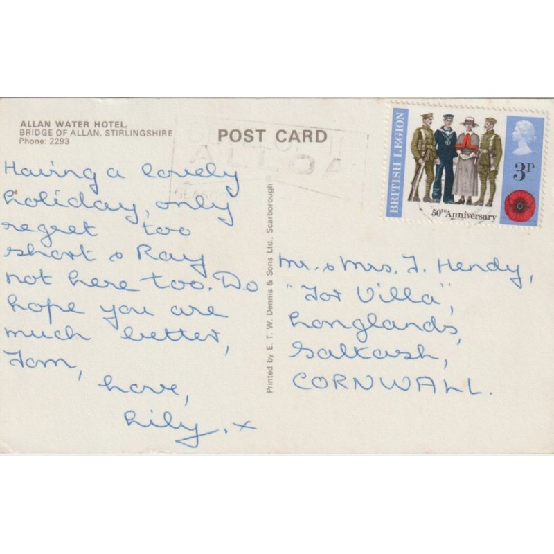 Allan Water Hotel. Bridge of Allan. Stirlingshire. E. T. w. Dennis & Sons Ltd. Postgått, fin stand, se scans for kvalitet.