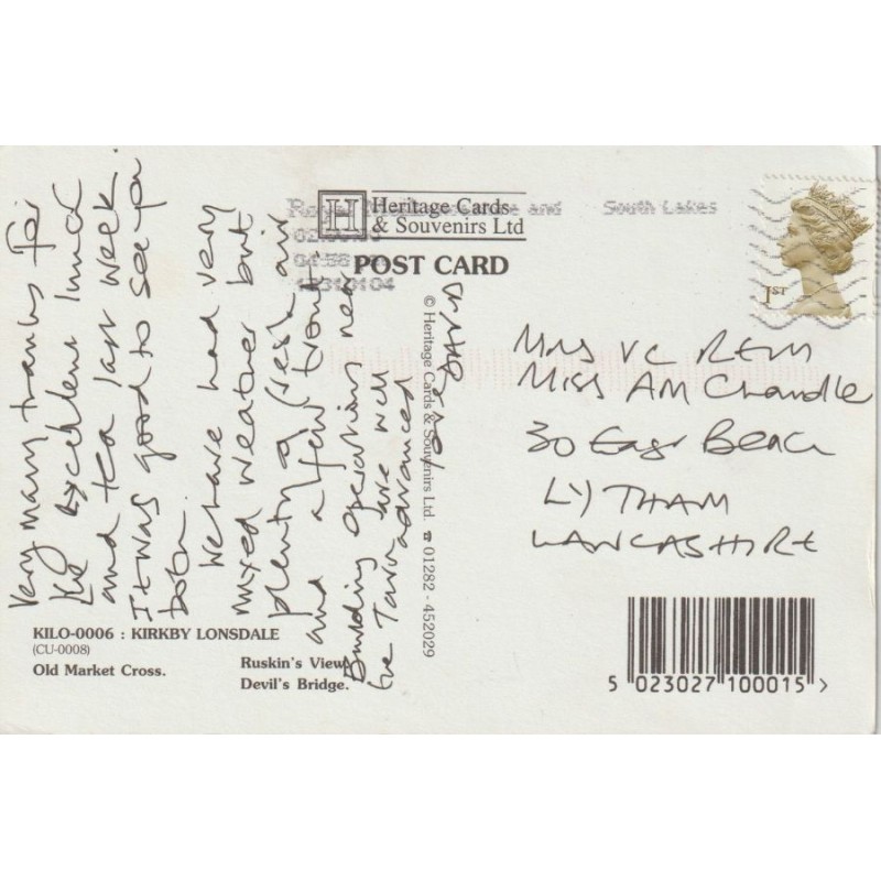 KILO-0006. Kirkby Lonsdale. Old Market Cross. Ruskin's View. Devil's Bridge. Heritage Cards & Souvenirs Ltd. Postgått, fin stand, se scans for kvalitet.