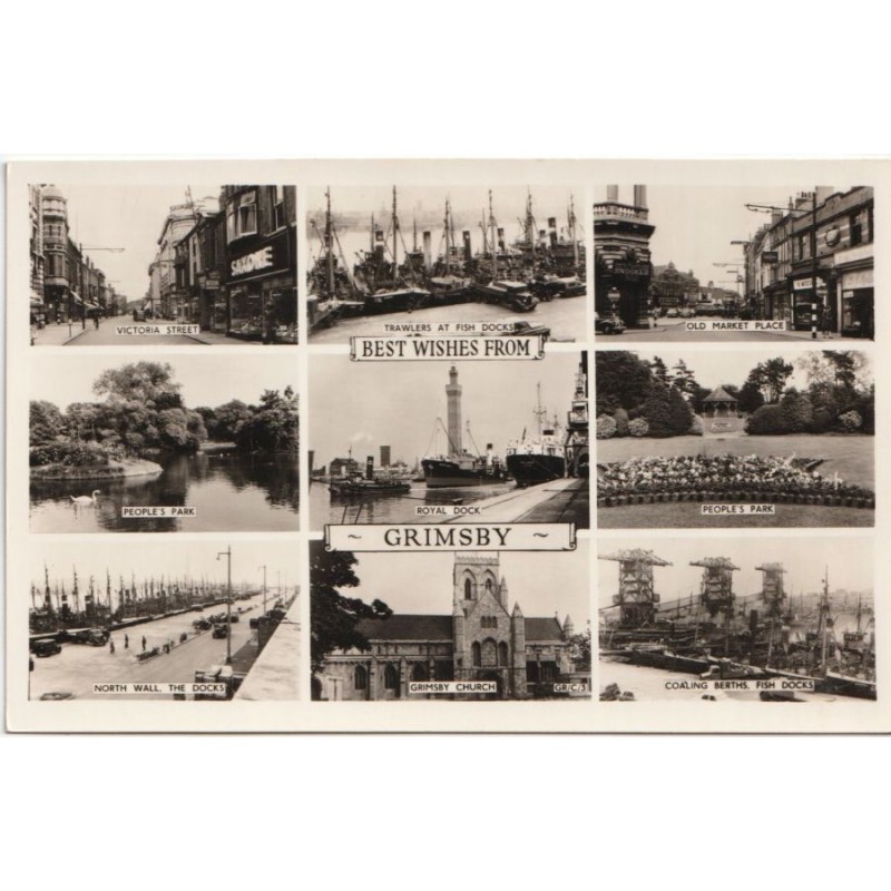 Mason's Alpha Series. Printed in England. Collage med motiver fra Grimsby i England. Victoria Street, Trawlers at Fish Docks, Old Market Place m.m. I veldi god stand, se scans for kvalitet.
